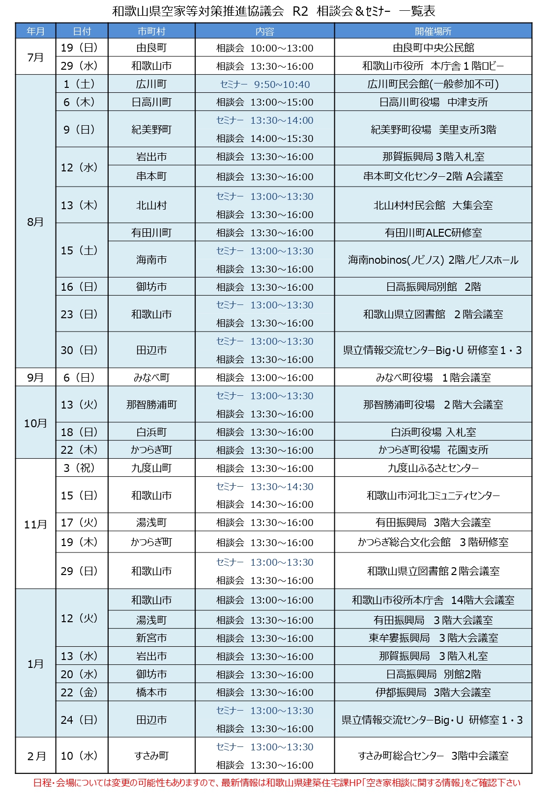 令和2年7月~令和3年3月の空き家なんでも相談会・セミナースケジュールについて
