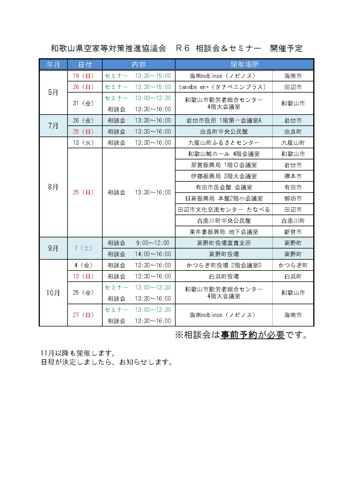 和歌山県空家等対策推進協議会R6相談会&セミナー開催予定